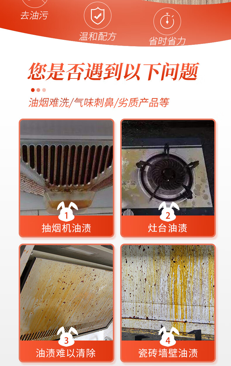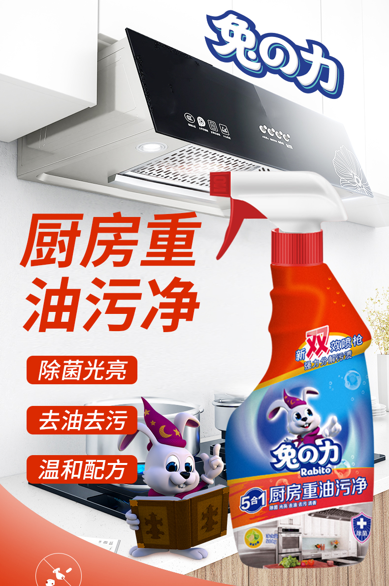兔の力油污清洁剂 500g 5合1厨房重油污净 油烟机灶台去油污清洁剂 500g 2瓶 瓷砖清洁剂*1瓶