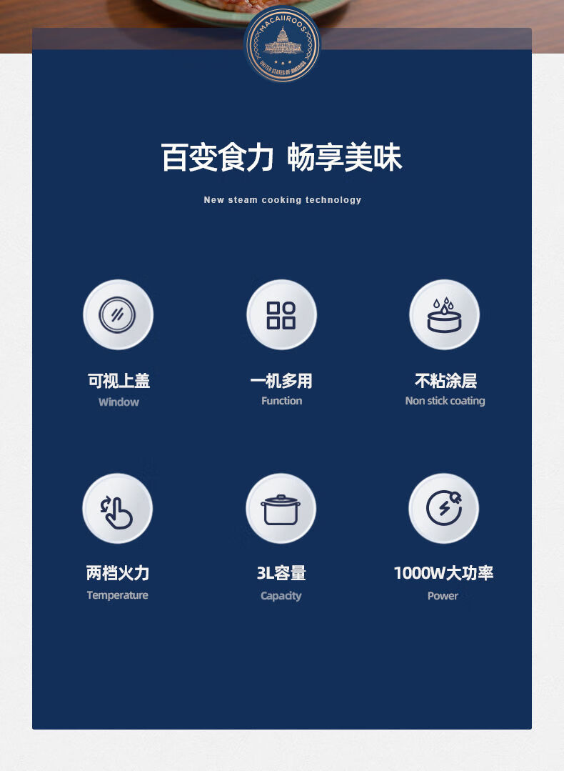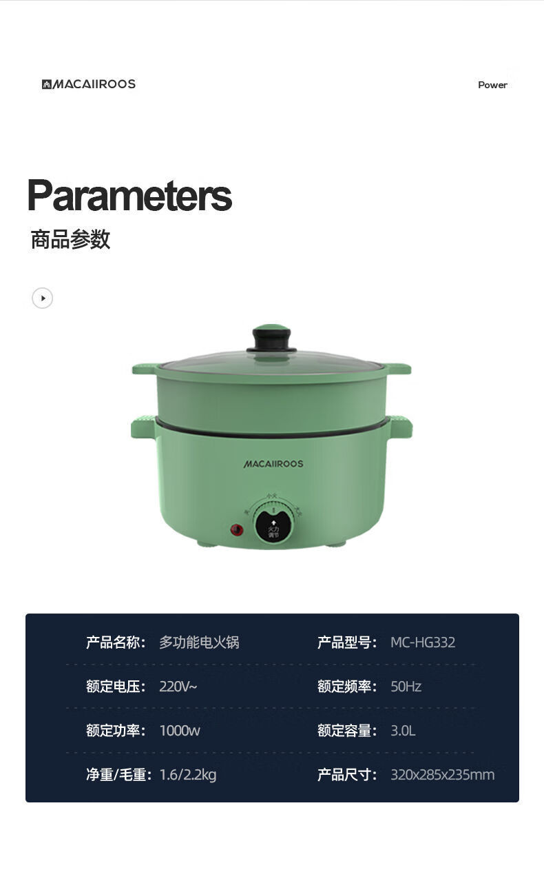 迈卡罗电煮锅火锅家用多功能电锅 MC-HG332(带蒸笼) MC-HG339(红色不带蒸笼)